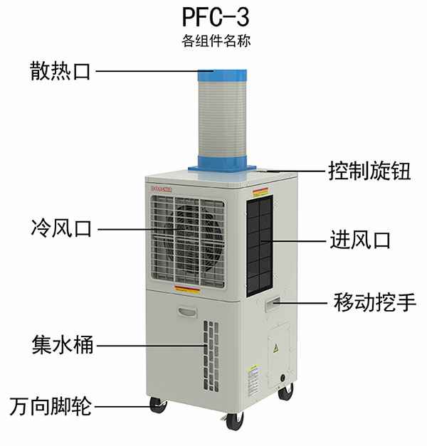 型号 PFC-3 电源 单相220V/50Hz 制冷量 3.5KW 制冷量 12000BTU 运转电流 5.8A 消耗电力 1.26KW 水箱容量 15L 风量 720m³/h 本体尺寸 W425 D505 H960(mm) 包装尺寸 W475 D555 H1165(mm) 毛重 56.5Kg 净重 51Kg 运行环境 25~45℃ - 01松下压缩机采用松下小型旋转式封闭压缩机与亲水铝箔换热器及内螺纹铜管,制冷速度更快,效率更高,更加节能静音。02独特排水设计抽拉式的水箱设计,集水、倒水更方便,也可以选择外接排水管。03一体化设计一体化设计,标准插头,无需安装,通电即用,方便快捷。04全铝制风叶采用全铝制风叶,风量更强更均匀。05优质马达采用全铜质马达,寿命更长,噪音更低。06防尘滤网配备多重过滤网,减少粉尘油腻的侵袭。07 90°自动摆风出风口可左右90°自动摆风,适用于大范围的降温。08万向轮设计采用了万向轮设计,方便移动到任意空间角落进行使用。